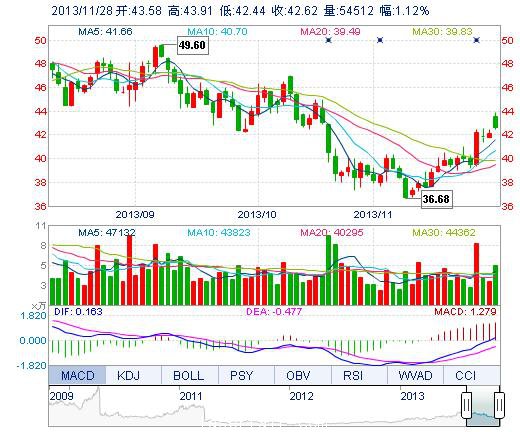 今開: 43.58 成交量: 5.45萬手 振幅: 3.49% 最高: 43.91 成交額: 2.34億元 換手率: 1.90% 最低: 42.44 總市值: 126.86億 市凈率: 8.35 昨收: 42.15 流通市值...