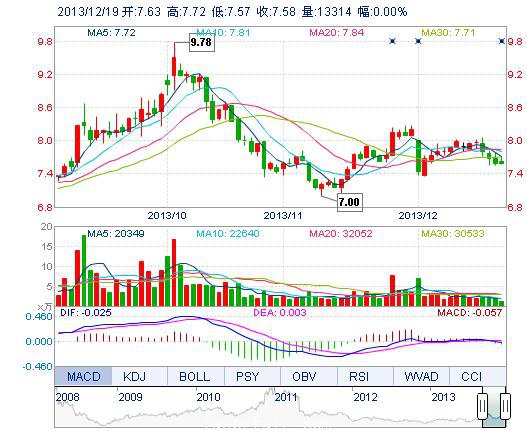 今開: 7.63 成交量: 1.33萬手 振幅: 1.98% 最高: 7.72 成交額: 1018.12萬元 換手率: 0.48% 最低: 7.57 總市值: 21.60億 市凈率: 3.46 昨收: 7.58 流通市值: ...