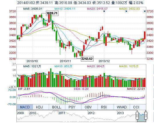 今開(kāi): 3439.11 最高: 3516.09 昨收: 3443.55 最低: 3434.03 成交量: 1091.84萬(wàn)手 振幅: 2.38% 成交額: 176.42億元