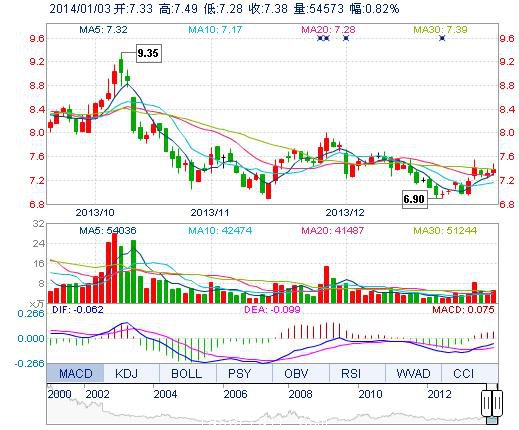 今開: 7.33 成交量: 5.46萬手 振幅: 2.87% 最高: 7.49 成交額: 4023.37萬元 換手率: 1.25% 最低: 7.28 總市值: 32.24億 市凈率: 2.36 昨收: 7.32 流通市值: ...