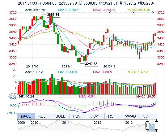 今開: 3504.02 最高: 3529.78 昨收: 3513.52 最低: 3500.03 成交量: 1297.47萬手 振幅: 0.85% 成交額: 195.62億元