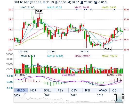 今開: 30.88 成交量: 2.04萬手 振幅: 2.14% 最高: 31.19 成交額: 6276.19萬元 換手率: 0.60% 最低: 30.53 總市值: 132.69億 市凈率: 8.18 昨收: 30.87 流通市...