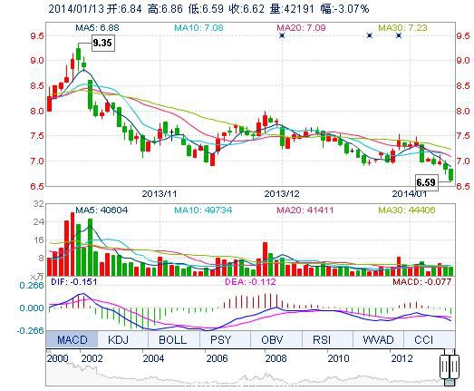 今開: 6.84 成交量: 4.22萬手 振幅: 3.95% 最高: 6.86 成交額: 2818.21萬元 換手率: 0.97% 最低: 6.59 總市值: 28.92億 市凈率: 2.12 昨收: 6.83 流通市值: ...