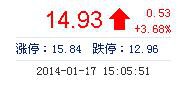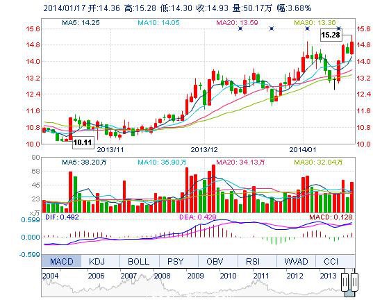 今開: 14.36 成交量: 50.17萬手 振幅: 6.81% 最高: 15.28 成交額: 7.52億元 換手率: 5.31% 最低: 14.30 總市值: 155.93億 市凈率: 4.46 昨收: 14.40 流通市值...