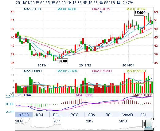 今開: 50.55 成交量: 6.93萬手 振幅: 6.81% 最高: 52.20 成交額: 3.48億元 換手率: 2.41% 最低: 48.73 總市值: 147.88億 市凈率: 9.74 昨收: 50.94 流通市值...