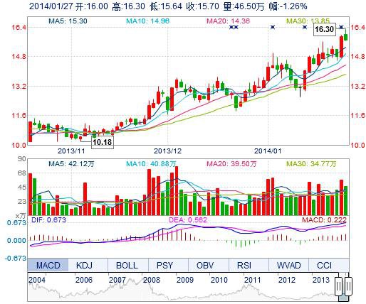 今開: 16.00 成交量: 46.50萬手 振幅: 4.15% 最高: 16.30 成交額: 7.42億元 換手率: 4.88% 最低: 15.64 總市值: 165.20億 市凈率: 4.69 昨收: 15.90 流通市值...