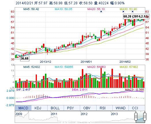 今開: 57.97 成交量: 4.02萬手 振幅: 2.93% 最高: 58.98 成交額: 2.35億元 換手率: 1.40% 最低: 57.28 總市值: 174.13億 市凈率: 11.47 昨收: 57.98 流通市值...