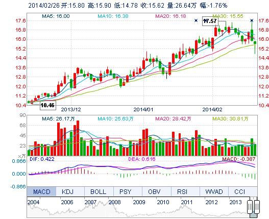 今開: 15.80 成交量: 26.64萬手 振幅: 7.04% 最高: 15.90 成交額: 4.11億元 換手率: 2.79% 最低: 14.78 總市值: 164.36億 市凈率: 4.67 昨收: 15.90 流通市值...