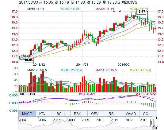 今開: 15.05 成交量: 18.83萬手 振幅: 4.34% 最高: 15.46 成交額: 2.86億元 換手率: 1.98% 最低: 14.80 總市值: 160.57億 市凈率: 4.56 昨收: 15.20 流通市值...