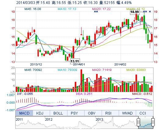今開: 15.40 成交量: 5.22萬手 振幅: 8.33% 最高: 16.55 成交額: 8292.92萬元 換手率: 7.61% 最低: 15.25 總市值: 21.84億 市凈率: 6.72 昨收: 15.60 流通市...