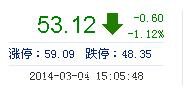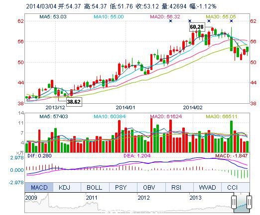 今開: 54.37 成交量: 4.27萬手 振幅: 4.86% 最高: 54.37 成交額: 2.27億元 換手率: 1.49% 最低: 51.76 總市值: 158.12億 市凈率: 10.41 昨收: 53.72 流通市值...