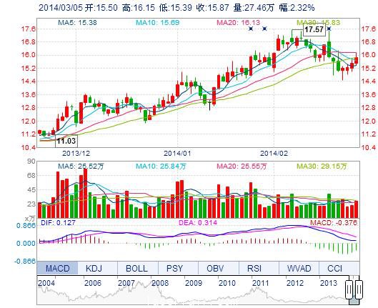 今開: 15.50 成交量: 27.46萬手 振幅: 4.90% 最高: 16.15 成交額: 4.35億元 換手率: 2.88% 最低: 15.39 總市值: 166.99億 市凈率: 4.74 昨收: 15.51 流通市值...
