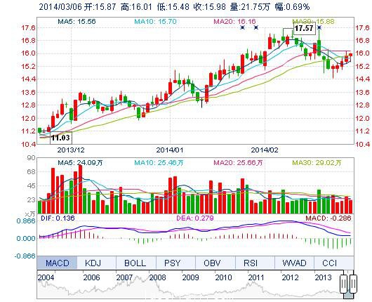 今開: 15.87 成交量: 21.75萬手 振幅: 3.34% 最高: 16.01 成交額: 3.41億元 換手率: 2.28% 最低: 15.48 總市值: 168.15億 市凈率: 4.77 昨收: 15.87 流通市值...