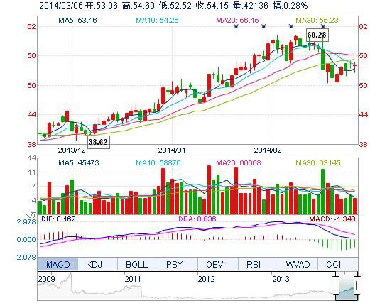 今開: 53.96 成交量: 4.21萬手 振幅: 4.02% 最高: 54.69 成交額: 2.27億元 換手率: 1.47% 最低: 52.52 總市值: 161.18億 市凈率: 10.61 昨收: 54.00 流通市值...