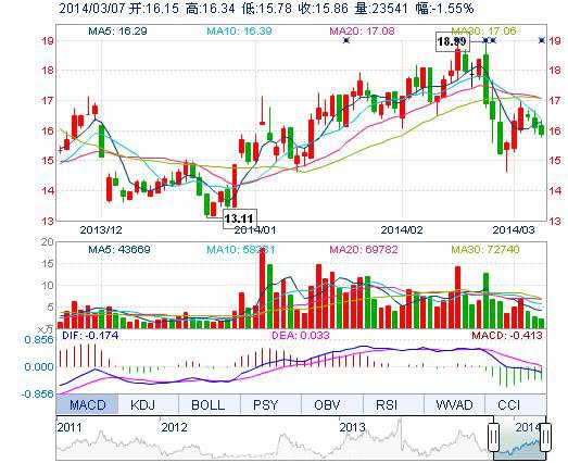 | 今 開: | 16.15 | 成交量: | 2.35萬手 | 振 幅: | 3.48% |