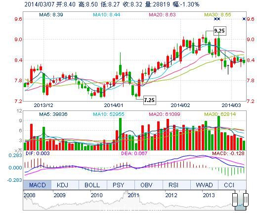 今開: 8.40 成交量: 2.88萬手 振幅: 2.73% 最高: 8.50 成交額: 2414.29萬元 換手率: 1.05% 最低: 8.27 總市值: 23.71億 市凈率: 3.80 昨收: 8.43 流通市值: ...