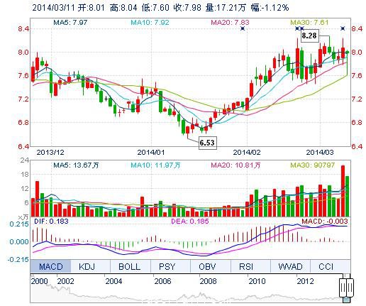 今開: 8.01 成交量: 17.21萬手 振幅: 5.45% 最高: 8.04 成交額: 1.34億元 換手率: 3.94% 最低: 7.60 總市值: 34.86億 市凈率: 2.55 昨收: 8.07 流通市值: 34...