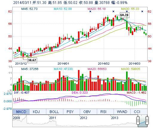 今開: 51.30 成交量: 3.08萬手 振幅: 3.56% 最高: 51.85 成交額: 1.57億元 換手率: 1.07% 最低: 50.02 總市值: 151.45億 市凈率: 9.97 昨收: 51.39 流通市值...