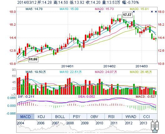 | 今 開: | 14.28 | 成交量: | 13.53萬手 | 振 幅: | 4.06% |