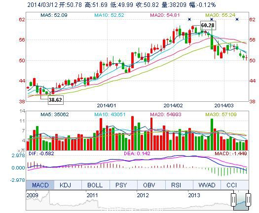 | 今 開: | 50.78 | 成交量: | 3.82萬手 | 振 幅: | 3.34% |