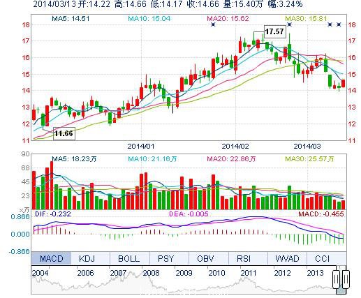 今開: 14.22 成交量: 15.40萬手 振幅: 3.45% 最高: 14.66 成交額: 2.23億元 換手率: 1.62% 最低: 14.17 總市值: 154.26億 市凈率: 4.38 昨收: 14.20 流通市值...