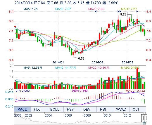 今開: 7.64 成交量: 7.48萬手 振幅: 3.64% 最高: 7.66 成交額: 5609.88萬元 換手率: 1.71% 最低: 7.38 總市值: 32.59億 市凈率: 2.39 昨收: 7.69 流通市值: ...