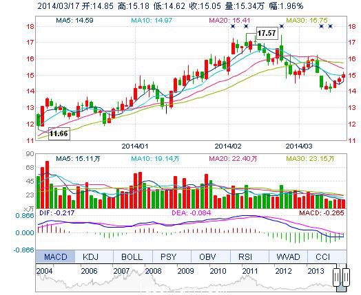 | 今 開: | 14.85 | 成交量: | 15.34萬手 | 振 幅: | 3.79% |