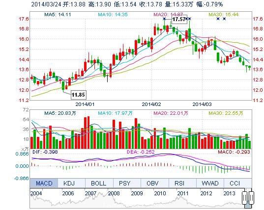 今開: 13.88 成交量: 15.33萬手 振幅: 2.59% 最高: 13.90 成交額: 2.11億元 換手率: 1.61% 最低: 13.54 總市值: 145.00億 市凈率: 4.12 昨收: 13.89 流通市值...