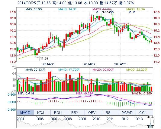 今開: 13.76 成交量: 14.62萬手 振幅: 2.47% 最高: 14.00 成交額: 2.02億元 換手率: 1.53% 最低: 13.66 總市值: 146.26億 市凈率: 4.15 昨收: 13.78 流通市值...