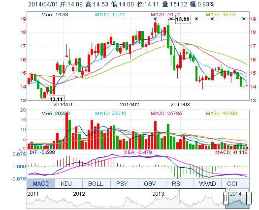 | 今 開: | 14.09 | 成交量: | 1.51萬手 | 振 幅: | 3.79% |
