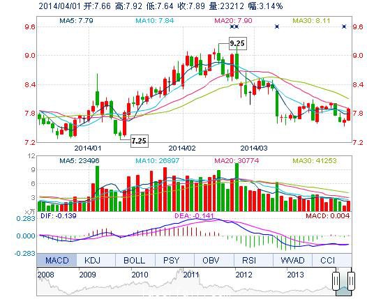 今開: 7.66 成交量: 2.32萬手 振幅: 3.66% 最高: 7.92 成交額: 1814.74萬元 換手率: 0.84% 最低: 7.64 總市值: 22.49億 市凈率: 3.61 昨收: 7.65 流通市值: ...