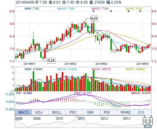 | 今 開: | 7.98 | 成交量: | 2.77萬手 | 振 幅: | 1.63% |