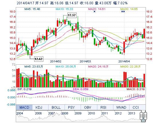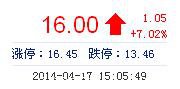 今開: 14.97 成交量: 43.08萬手 振幅: 7.29% 最高: 16.06 成交額: 6.77億元 換手率: 4.52% 最低: 14.97 總市值: 168.36億 市凈率: 4.78 昨收: 14.95 流通市值...