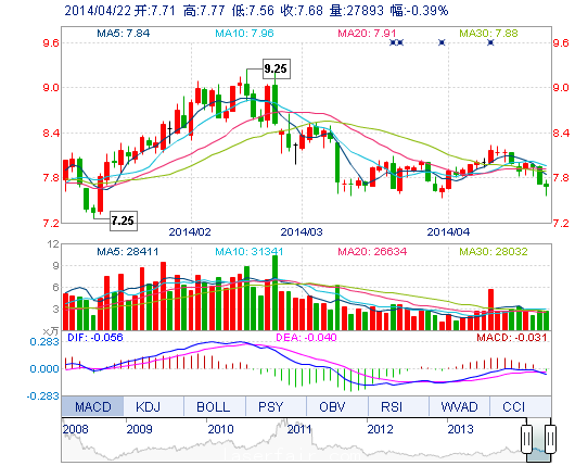 | 今 開: | 7.71 | 成交量: | 2.79萬手 | 振 幅: | 2.72% |