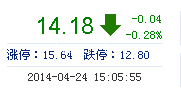 | 今 開: | 14.20 | 成交量: | 1.01萬手 | 振 幅: | 1.76% |