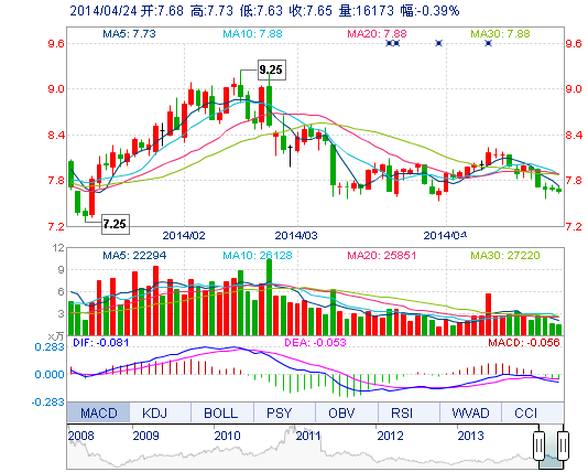 今開: 7.68 成交量: 1.62萬手 振幅: 1.30% 最高: 7.73 成交額: 1240.47萬元 換手率: 0.59% 最低: 7.63 總市值: 21.80億 市凈率: 3.50 昨收: 7.68 流通市值: ...