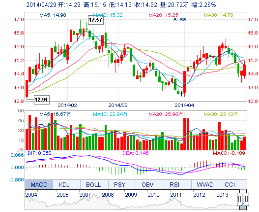今開: 14.29 成交量: 20.72萬手 振幅: 6.99% 最高: 15.15 成交額: 3.06億元 換手率: 2.17% 最低: 14.13 總市值: 157.00億 市凈率: -- 昨收: 14.59 流通市值:...
