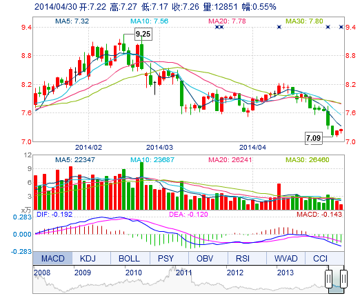 今開: 7.22 成交量: 1.29萬手 振幅: 1.39% 最高: 7.27 成交額: 929.89萬元 換手率: 0.47% 最低: 7.17 總市值: 20.69億 市凈率: 3.22 昨收: 7.22 流通市值: 1...