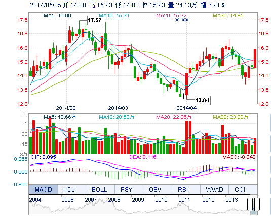 今開: 14.88 成交量: 24.13萬手 振幅: 7.38% 最高: 15.93 成交額: 3.74億元 換手率: 2.52% 最低: 14.83 總市值: 168.11億 市凈率: 4.56 昨收: 14.90 流通市值...