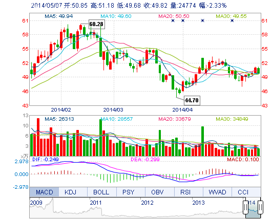 | 最 高: | 51.18 | 成交額: | 1.25億元 | 換手率: | 0.86% |