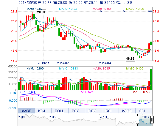 | 今 開: | 20.77 | 成交量: | 3.95萬手 | 振 幅: | 4.32% |