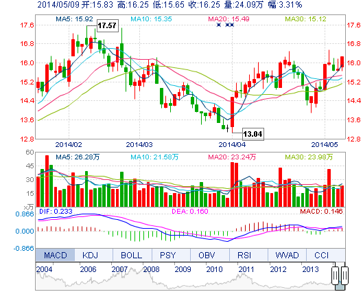今開: 15.83 成交量: 24.09萬手 振幅: 3.81% 最高: 16.25 成交額: 3.84億元 換手率: 2.52% 最低: 15.65 總市值: 171.48億 市凈率: 4.65 昨收: 15.73 流通市值...