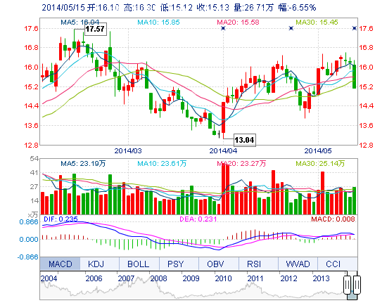 今開: 16.10 成交量: 26.71萬手 振幅: 7.29% 最高: 16.30 成交額: 4.17億元 換手率: 2.79% 最低: 15.12 總市值: 159.66億 市凈率: 4.33 昨收: 16.19 流通市值...
