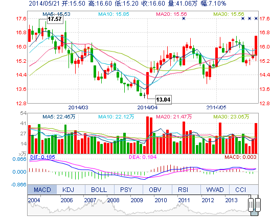 今開: 15.50 成交量: 41.06萬手 振幅: 9.03% 最高: 16.60 成交額: 6.61億元 換手率: 4.30% 最低: 15.20 總市值: 175.18億 市凈率: 4.75 昨收: 15.50 流通市值...
