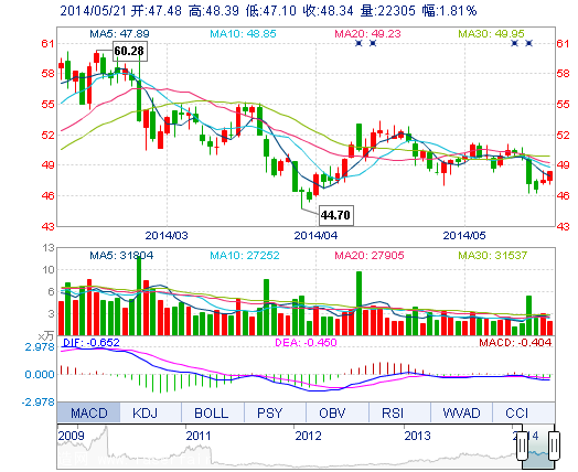 今開: 47.48 成交量: 2.23萬手 振幅: 2.72% 最高: 48.39 成交額: 1.07億元 換手率: 0.77% 最低: 47.10 總市值: 143.89億 市凈率: 8.66 昨收: 47.48 流通市值...