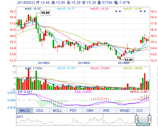 今開: 15.48 成交量: 5.78萬手 振幅: 3.65% 最高: 15.95 成交額: 9041.65萬元 換手率: 8.43% 最低: 15.38 總市值: 20.62億 市凈率: 6.24 昨收: 15.62 流通市...