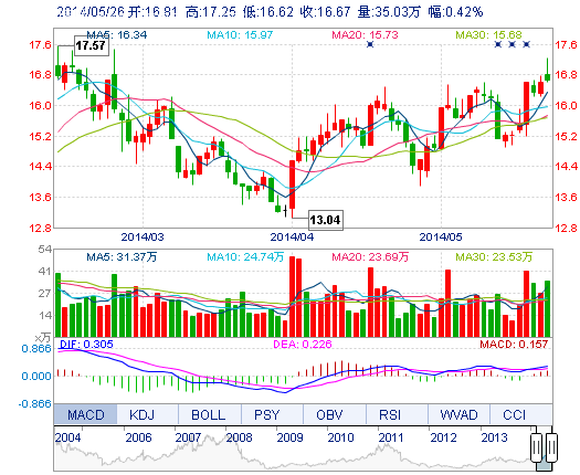 今開: 16.81 成交量: 35.03萬手 振幅: 3.80% 最高: 17.25 成交額: 5.92億元 換手率: 3.66% 最低: 16.62 總市值: 175.91億 市凈率: 4.77 昨收: 16.60 流通市值...