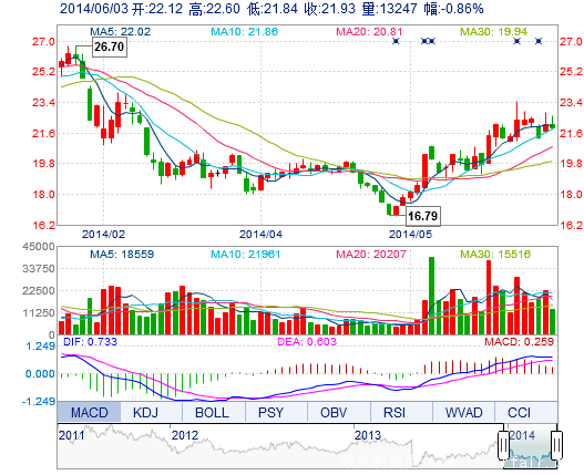 | 今 開: | 22.12 | 成交量: | 1.32萬手 | 振 幅: | 3.44% |