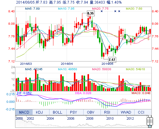 今開: 7.83 成交量: 3.64萬手 振幅: 2.55% 最高: 7.95 成交額: 2868.84萬元 換手率: 0.83% 最低: 7.75 總市值: 34.68億 市凈率: 2.49 昨收: 7.83 流通市值: ...