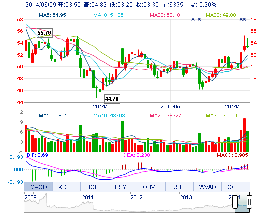 今開: 53.50 成交量: 6.34萬手 振幅: 3.05% 最高: 54.83 成交額: 3.42億元 換手率: 2.20% 最低: 53.20 總市值: 158.65億 市凈率: 9.55 昨收: 53.46 流通市值...